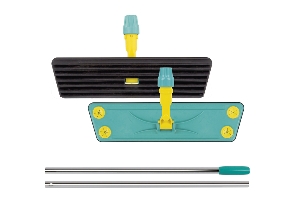 Soporte con láminas de goma termoplástica y dsicos sujeta-paños redondos, completo con mango cromado en dos piezas y 130cm de longitud total.