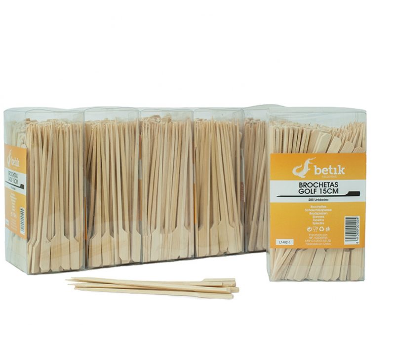 Ref. 001010342DESCRIPCIÓN: Brocheta bambú golf.ENVASE: Estuche PVC.CONTENIDO: 200 uds. aprox.EMBALAJE: 25 estuchesPALETIZACIÓN: 42 embalajes (3 capas de 14 emb.)PESO: Embalaje: 5,45 kg. / Palet: 300 Kg.